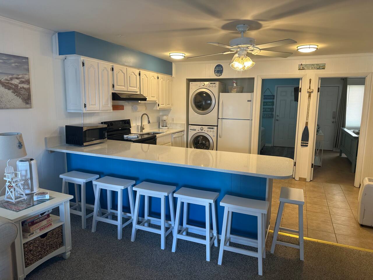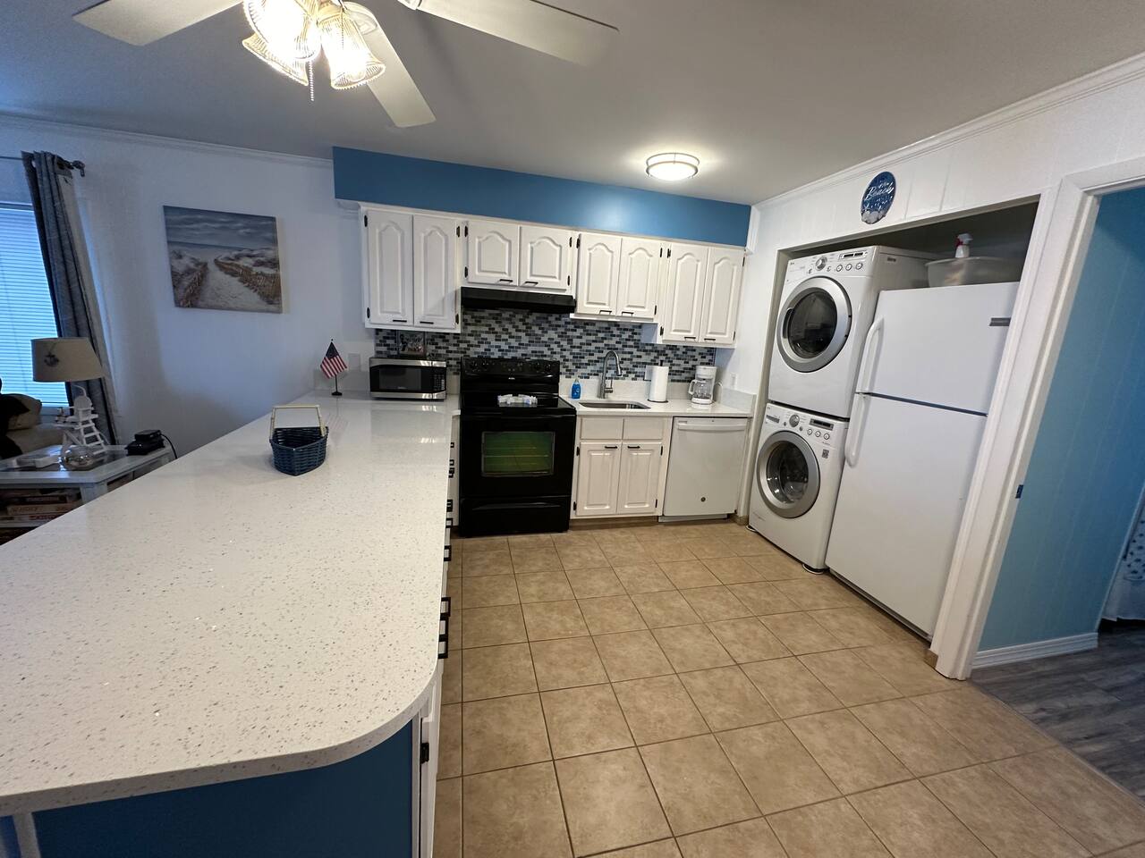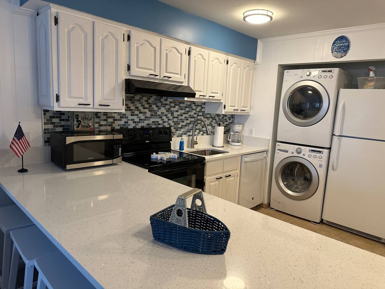 Very clean condo! All sheets, blankets, and towels provided. Cleaned before EVERY guest. Personal items such as toilet paper and paper towels, we supply enough to get your vacation started. Our kitchen is fully stocked with kitchen gadgets for all your cooking needs. Just bring the food!. Our large patio is great for dining or relaxing. A beach storage box on the patio with beach accessories for your use. One private parking spot